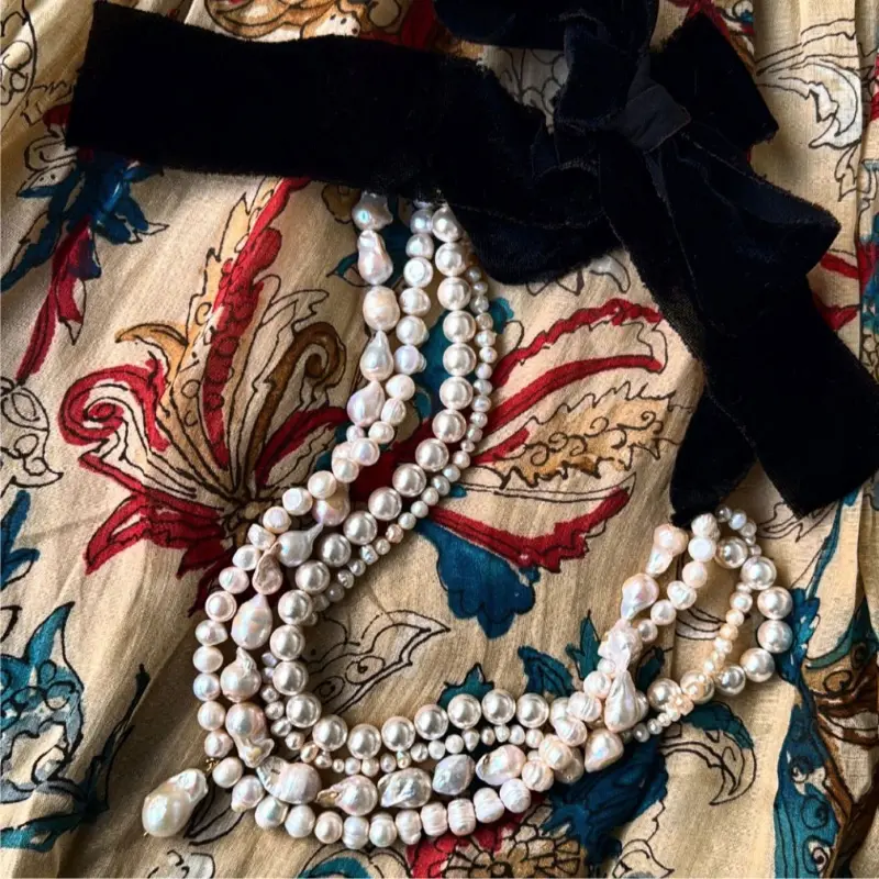Collar con 4 hilos de perlas naturales, barrocas y de Mallorca, se abrocha con listón de terciopelo negro a una cara.