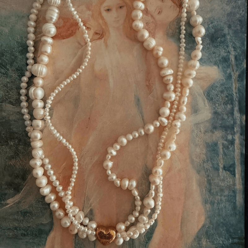 Collar con tres hilos de perlas cultivadas naturales de diferentes tamaños con dije corazón de acero inoxidable con inscripción «Lucky to have you»